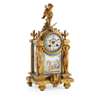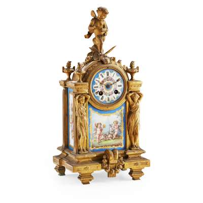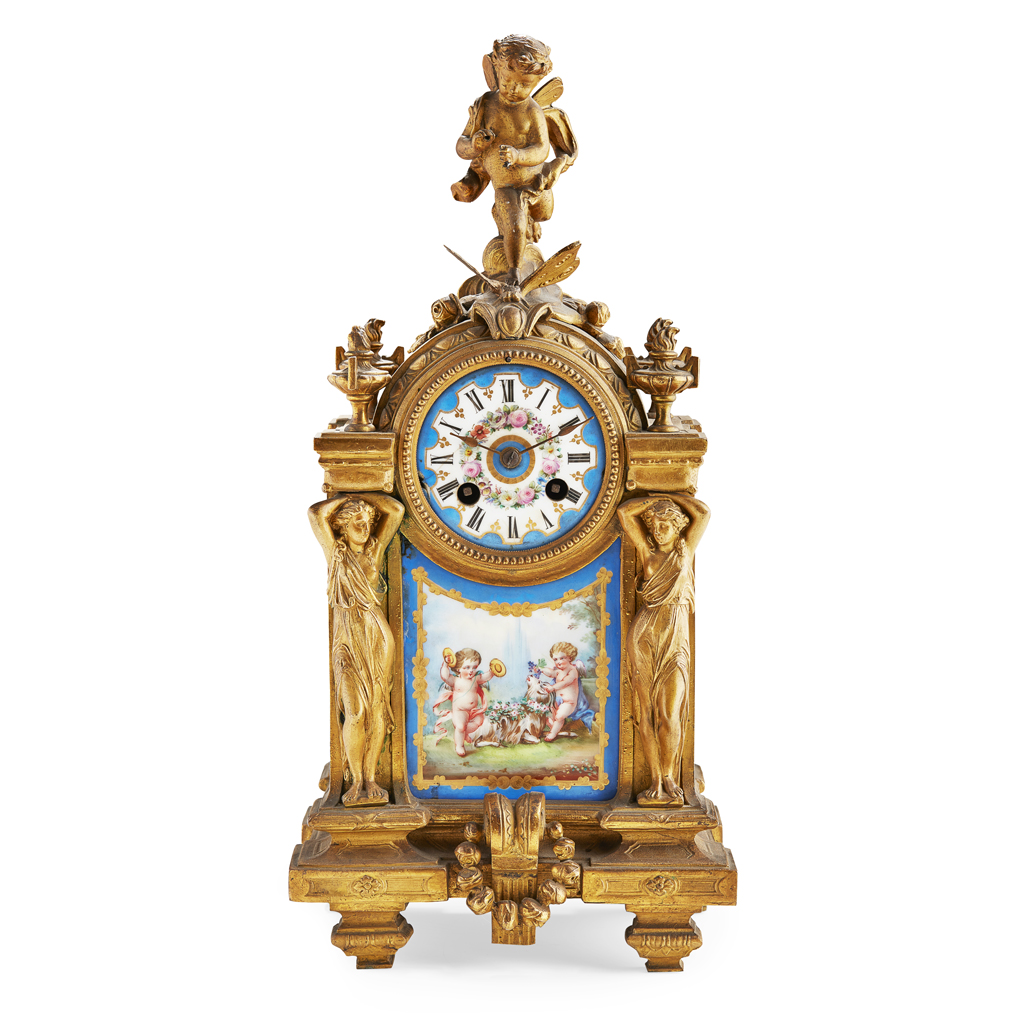 the circular painted porcelain Roman number dial set in a gilt metal case surmounted by a putto and flaming urn finials; over a porcelain plaque depicting bacchanalian putti flanked by gilt metal caryatids, the back stamped P. H. MOUREY 69