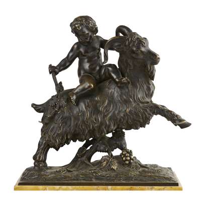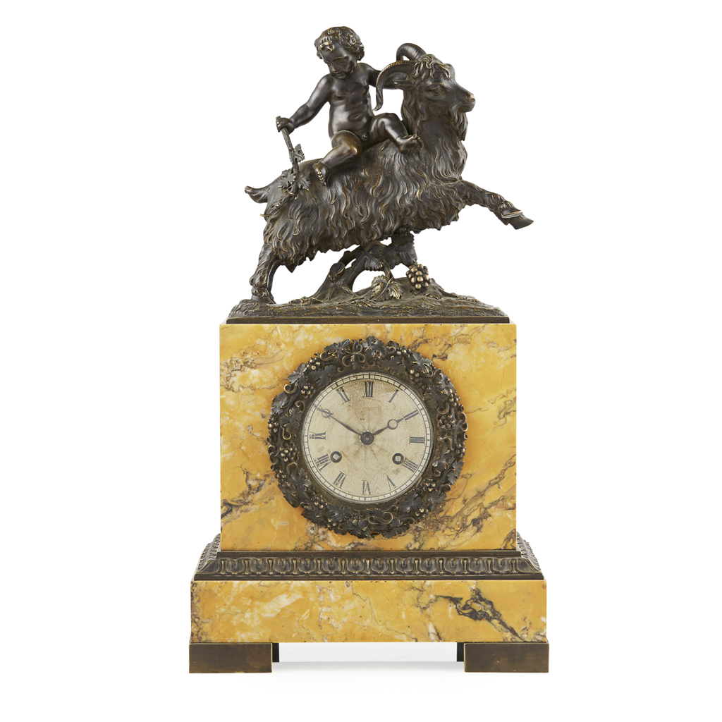 the bronze figural pediment depicting a bacchanalian putto riding a goat, above the engine-turned dial with Roman numerals, with a pin-wheel escapement and month duration movement striking a bell