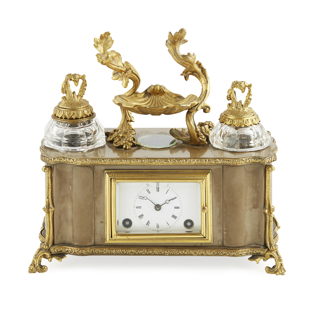the shaped top fitted with two covered glass inkwells flanking a pen holder united by a shell-form tray, above the white enamelled dial and scrolled feet, the movement stamped MOSER/ A PARIS/ 3249, striking a bell