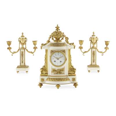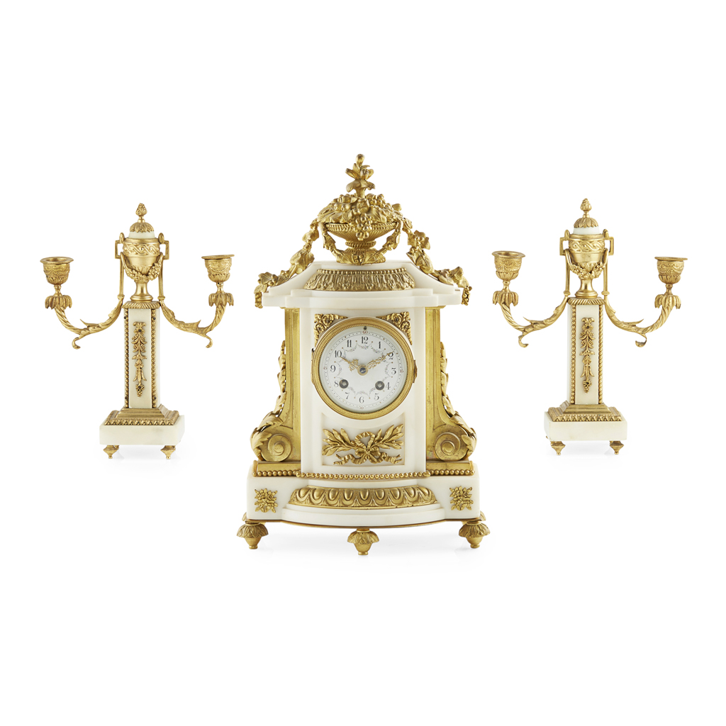 FRENCH WHITE MARBLE AND GILT BRONZE CLOCK GARNITURE