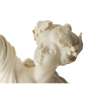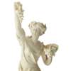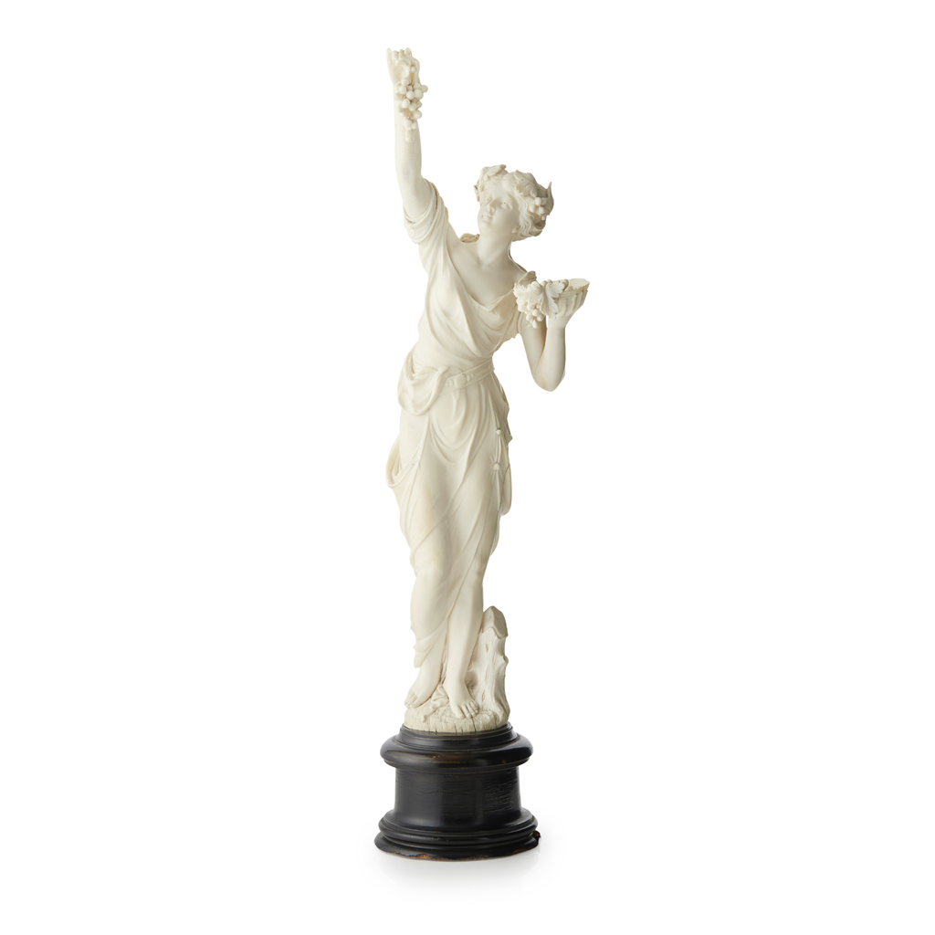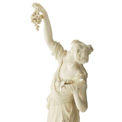 depicting a draped young woman holding aloft a cluster of grapes with her right hand, a basket of fruit in her other hand, on a circular moulded ebony base, unsigned