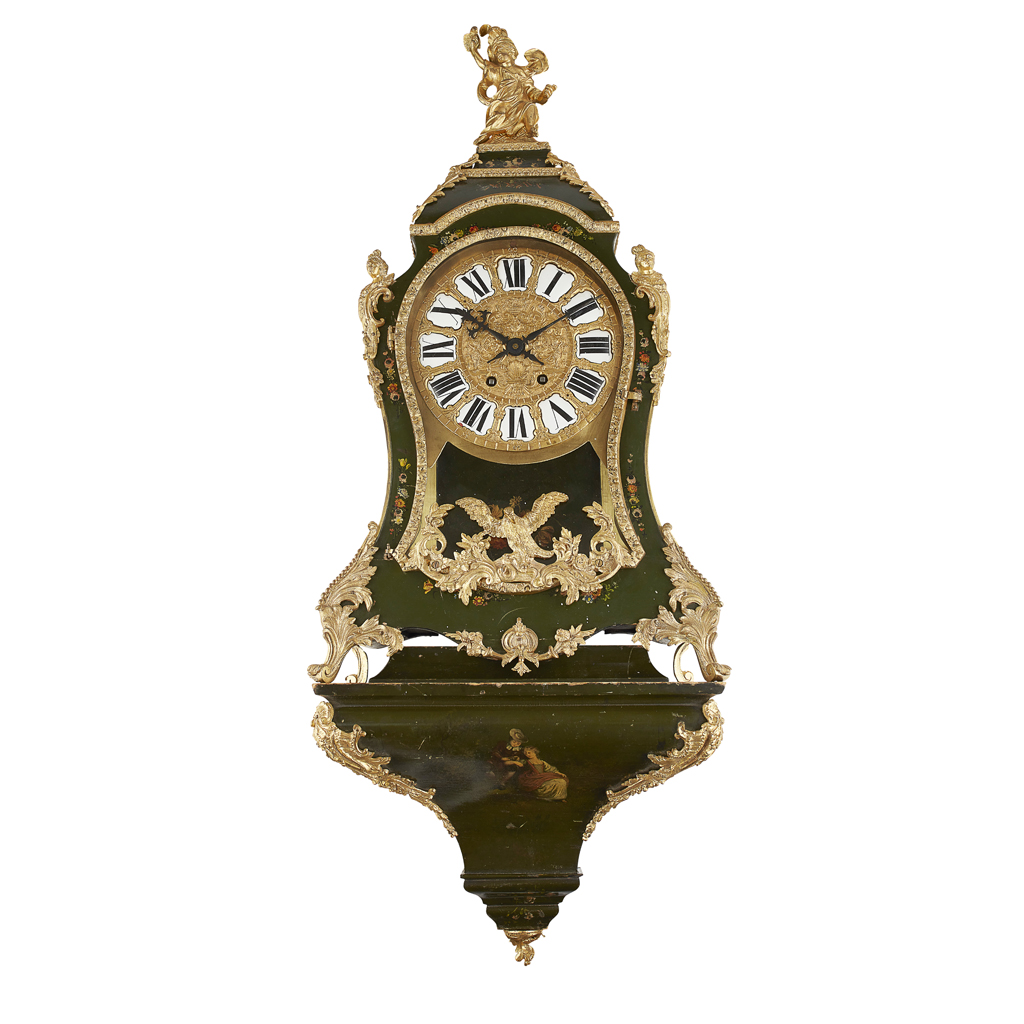 FRENCH LOUIS XV STYLE GREEN JAPANNED BRACKET CLOCK AND BRACKET