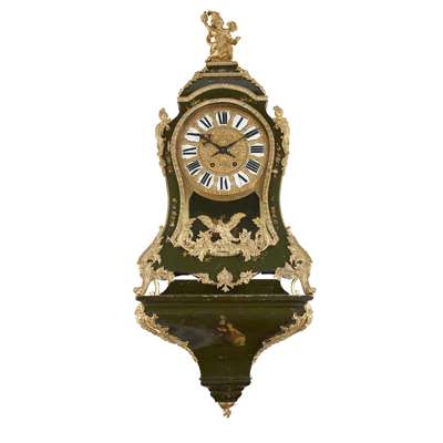 the gilt dial set with white enamel Roman numeral cartouches, in a green waisted case painted with flower sprays and outlined with gilt metal mounts; the arched pediment surmounted by a figural finial, the eight day movement striking a bell, serial no. 3747; the matching bracket painted with a pair of lovers
