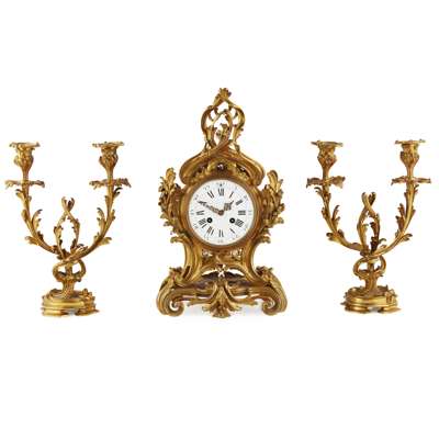 FRENCH GILT BRONZE ROCOCO STYLE CLOCK GARNITURE, LEROY ET FILS
