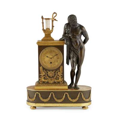 FRENCH EMPIRE GILT AND PATINATED BRONZE FIGURAL MANTEL TIMEPIECE