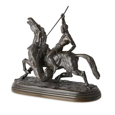 bronze, mid-brown patina, modelled with a man on horseback holding a spear, being attacked by a lion, signed I. BONHEUR to the oval base