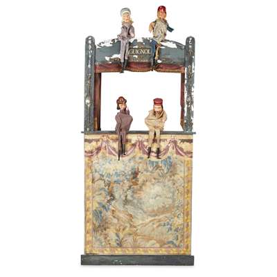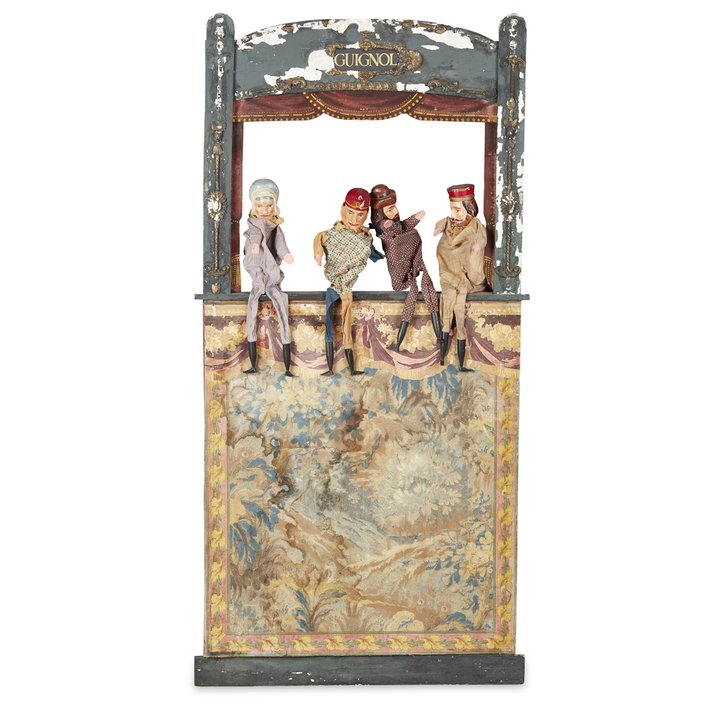 painted board and gesso in three sections, the proscenium bearing 'GUIGNOL' in raised script; together with three vintage carved wood and fabric hand puppets to include Mr Punch, Judy, The King, The Queen, and another man