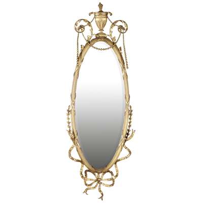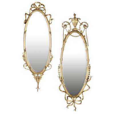 each with an oval mirror plate in ribbon tied giltwood frames with foliate scrolls, one with an urn finial with bead swags (2)