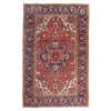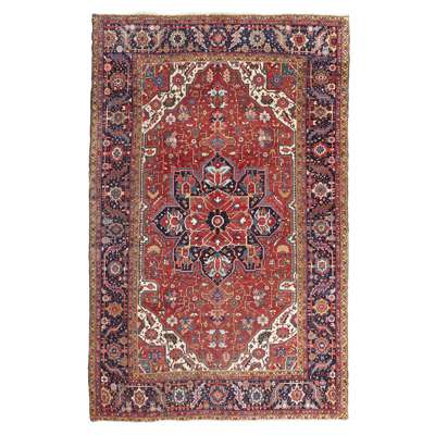 the red field with indigo and salmon pink medallion, ivory and salmon pink spandrels, within indigo rosette and vine border
