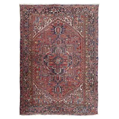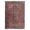 the red field with indigo/slate grey and salmon pink medallion, ivory and pink spandrels, within indigo/slate grey turtle palmette and vine border