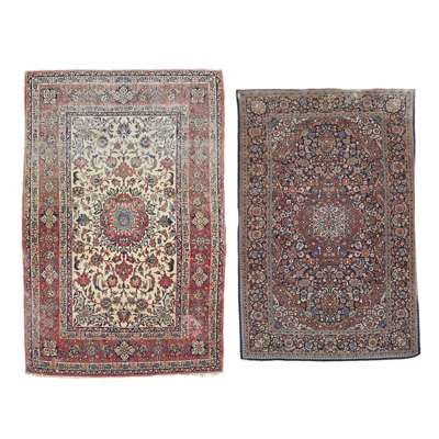 the indigo field with red and cream medallion, similar spandrels, within indigo palmette, rosette and foliate border; and an ISFAHAN RUG, the cream field with red medallion, within red palmette and foliate vine border (2)