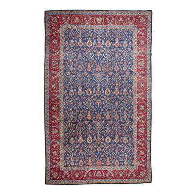 the indigo field with allover palmette and foliate lattice pattern, within red palmette and foliate border