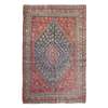 the indigo field with rust red lozenge medallion, rust red spandrels, within narrow brown geometric border