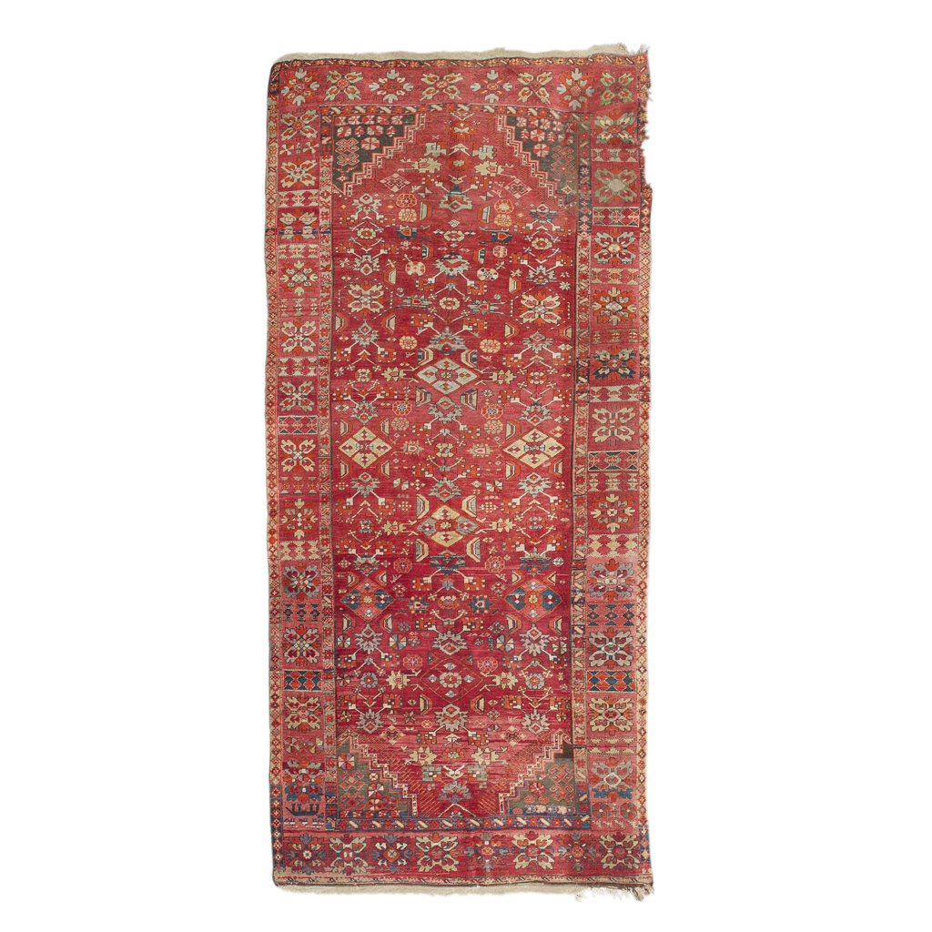 the red field with allover stylised foliate and lozenge pattern, within red rosette border