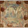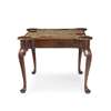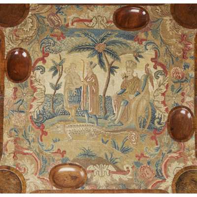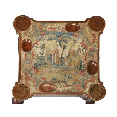 the shaped quarter-veneered folding top opening to a gros and petit point embroidered panel depicting a courtly scene, enclosed by candle stands and guinea wells, raised on cabriole legs with shell-carved knees, terminating in pad feet