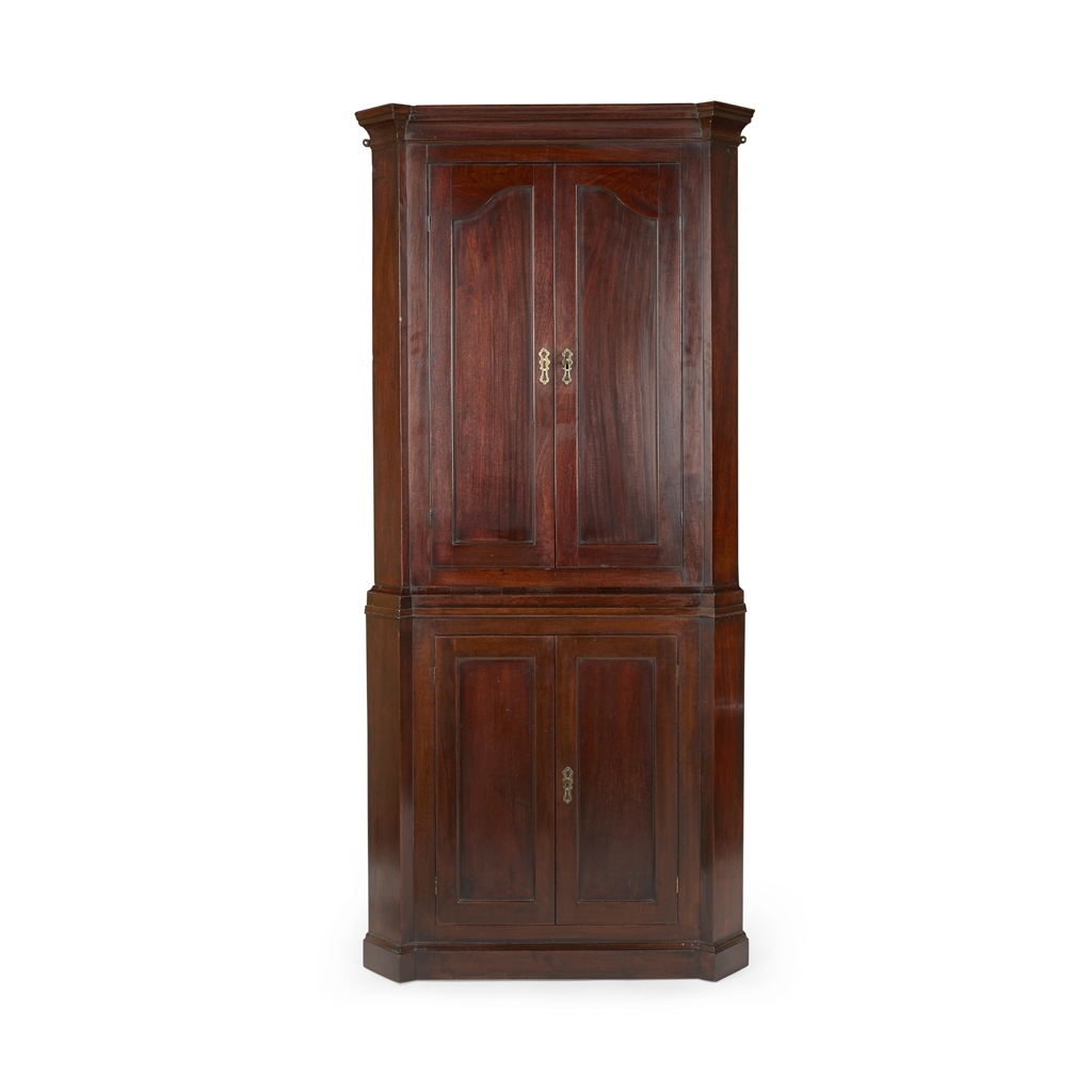the moulded and projecting cornice above fielded panel doors enclosing a painted and fitted interior, on a plinth base