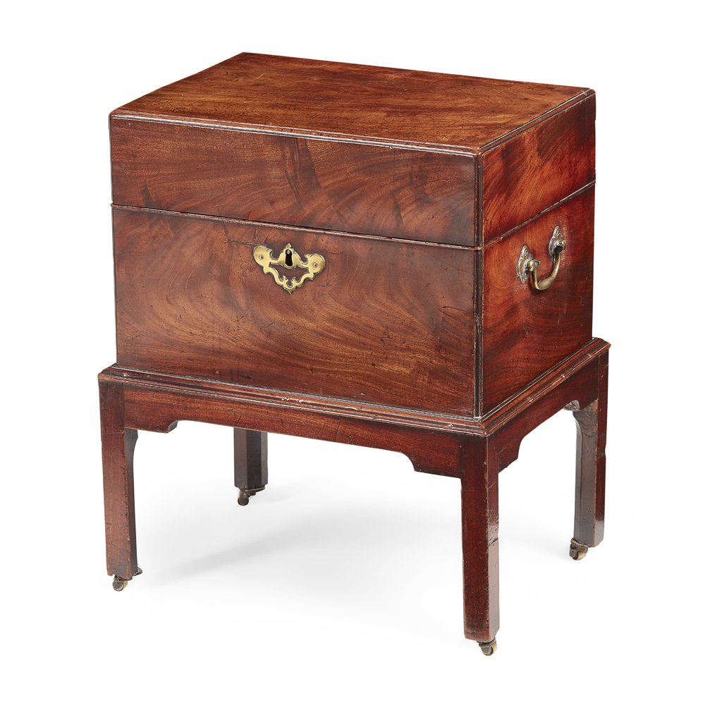 the hinged caddy top opening to a divided interior, with brass handles to the sides, on a base with straight square chamfered legs