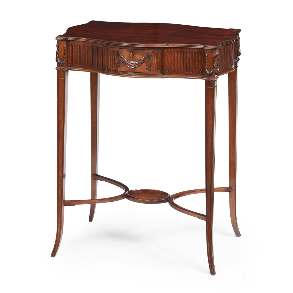 the serpentine rectangular top with a moulded edge over a fluted frieze centred by a short swag carved drawer and marked at the corners with further swags, on slender square tapered legs joined by curved stretchers united by a circular undertier; the drawer stamped 'EDWARD & ROBERTS'