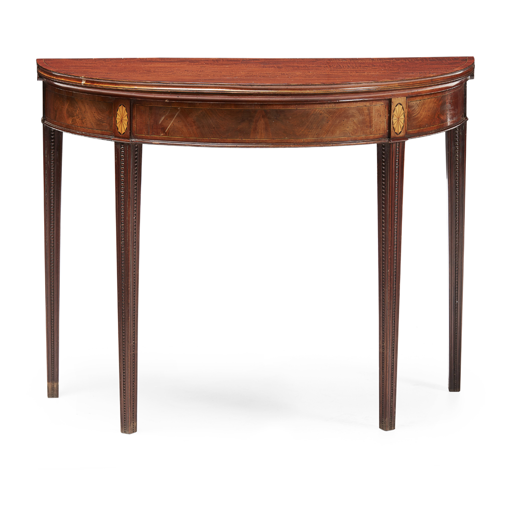 LATE GEORGE III MAHOGANY DEMI-LUNE AND INLAY CARD TABLE