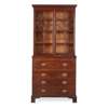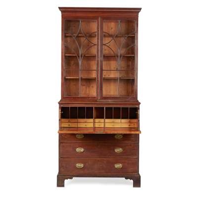 the moulded cornice above astragal glazed doors opening to shelves; the base with a deep secretaire drawer fitted with drawers and pigeon holes, above three graduated drawers, on bracket feet