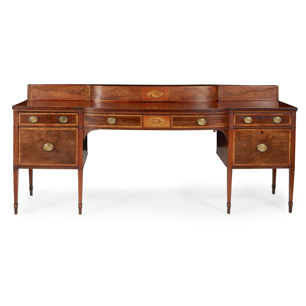 LATE GEORGE III MAHOGANY AND SATINWOOD CROSSBANDED BREAKFRONT SIDEBOARD