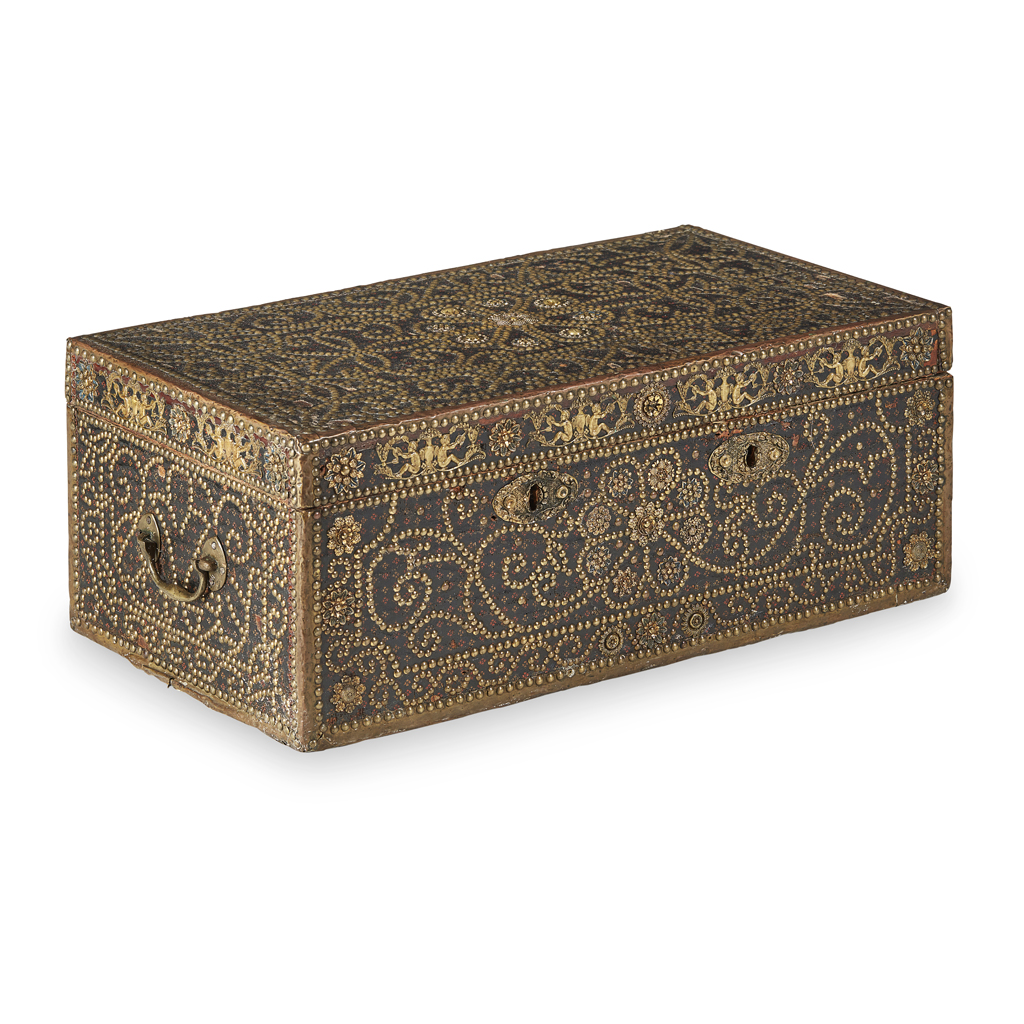 covered in black and polychrome decorated leather accented with brass studs and putti, the interior lined with period blue printed cotton fabric
