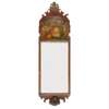 the arched scroll cut frame with a carved plume cresting above a panel painted with a floral still life, over a rectangular mirror plate in a moulded gilt slip