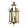 the scrolling corona with bell flower trails, above an hexagonal glazed panel body with rope twist supports, ending in a foliate drop finial