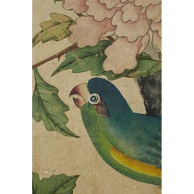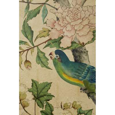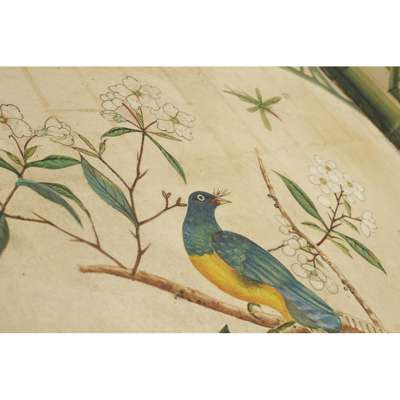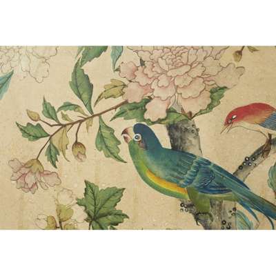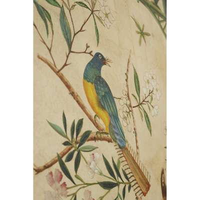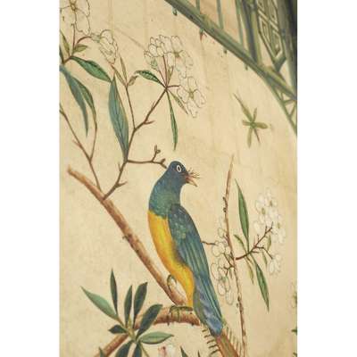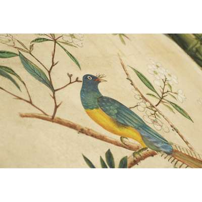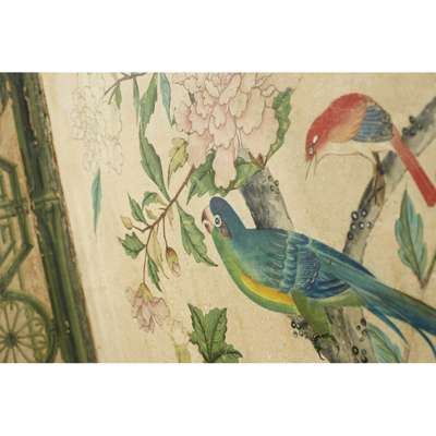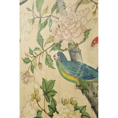 hand painted depicting exotic birds and butterflies in an aviary, with further birds perched amongst flowering peony, dogwood and prunus