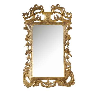 the rectangular mirror plate in a frame with C-scrolls, flower garlands and surmounted by a double arched pierced cresting
