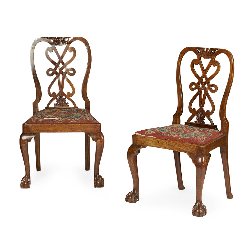 the pierced and foliate carved interlaced splats above drop-in seats with needlework covers, raised on cabriole legs ending in claw and ball feet, the frames stamped with a coronet and initial 'D' and old paper inventory labels (2)