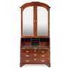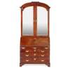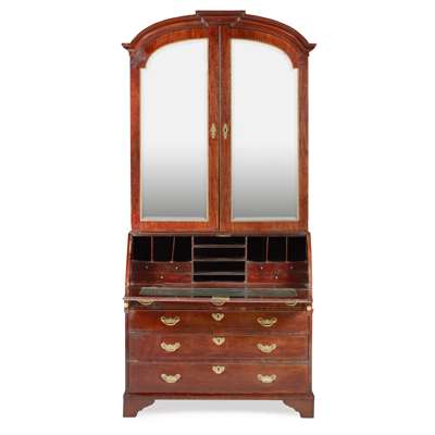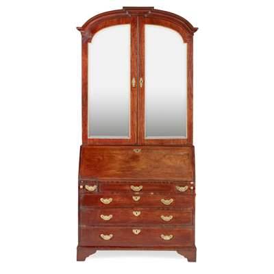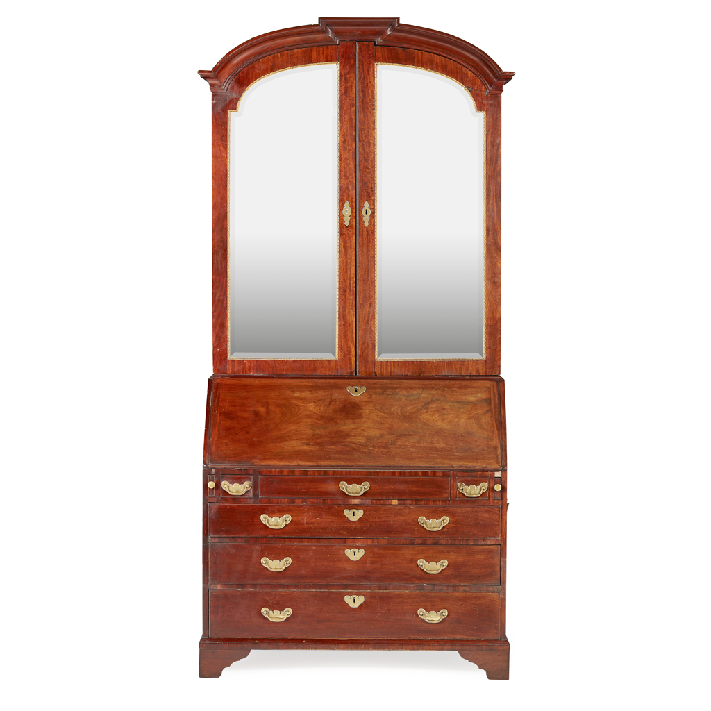 the arched moulded cornice above a pair of conforming mirrored doors opening to a shelved interior; the associated base with a slant front opening to pigeon holes and drawers, over four long graduated drawers, on bracket feet