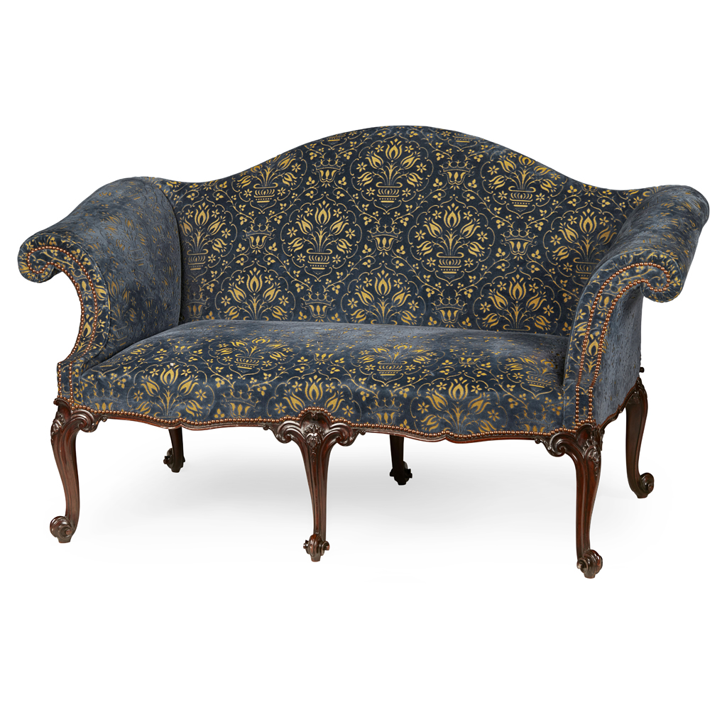 the serpentine back and high scroll arms above a padded serpentine seat, raised on carved cabriole legs ending in scroll toes, in blue and gold velvet upholstery