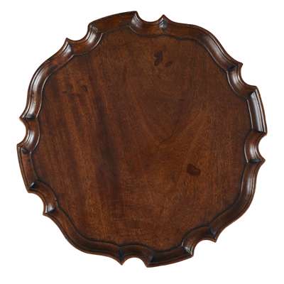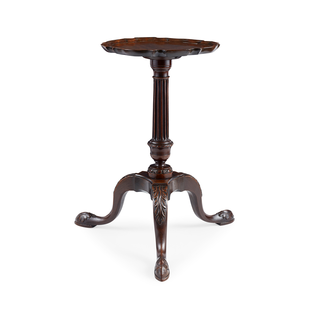 the shaped and moulded piecrust top on a turned and fluted tapered column carved at the base with ribbon wrapped flower heads, raised on acanthus carved cabriole legs ending in rocaille carved pointed pad feet