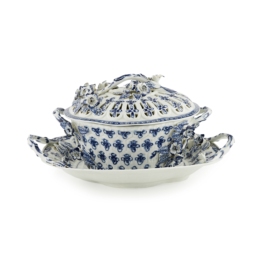 WORCESTER BLUE AND WHITE 'PINECONE' PATTERN CHESTNUT BASKET AND STAND