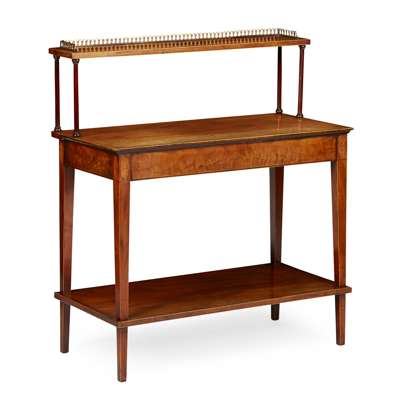 the superstructure with a pierced brass gallery raised on turned columns above a rectangular crossbanded top, on square tapered legs joined by an undertier