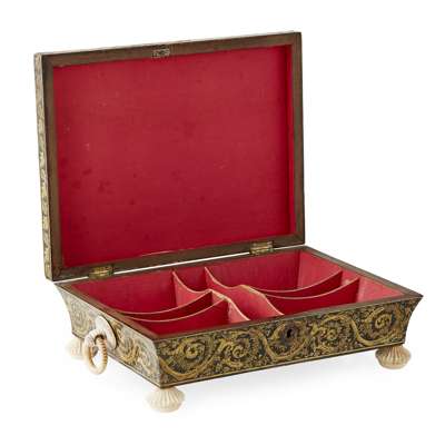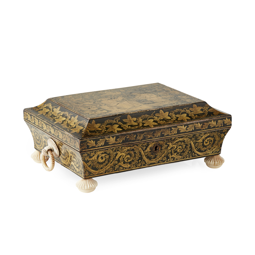of sarcophagus form with carved ivory loop handles, decorated with figures within scrolling foliage and vines, opening to a compartmented interior, raised on fluted ivory feet, with a handwritten label to the underside