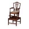 in the Hepplewhite style, the chair with a shield shaped back, drop-in seat and curved arms, on square tapered legs joined by stretchers and an adjustable footrest; the separate stand with straight legs