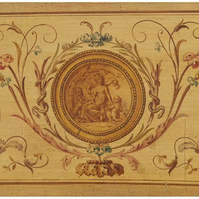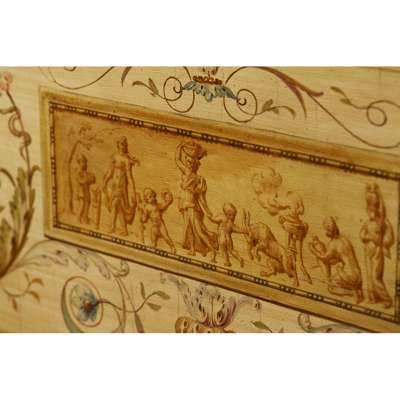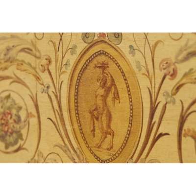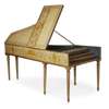 with ebony major and ivory minor keys, the yellow painted case decorated with neoclassical motifs, the interior painted with a scene of an 18th century musical fete, on reeded tapered legs
