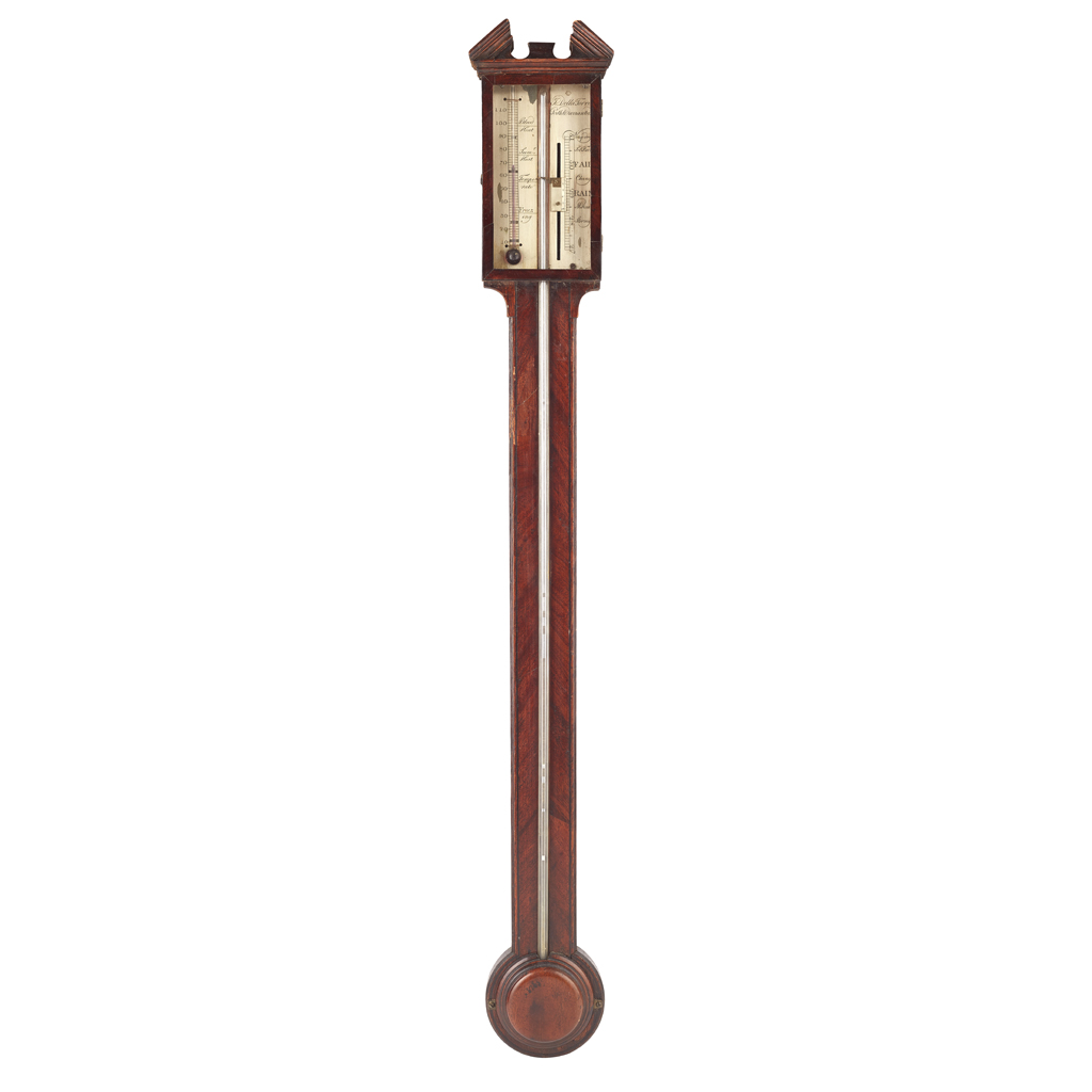 with an arched pediment above the silver vernier signed J. DELLA TORRE/ PERTH/ WARRANTED, with ebony banding and a circular cistern cover
