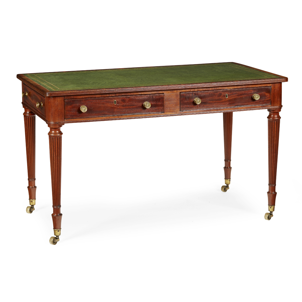 the rounded rectangular top with a reeded edge and a gilt tooled green leather insert, above pairs of short frieze drawers to one long side and dummy drawers to the others, raised on reeded tapered legs ending in brass caps and castors