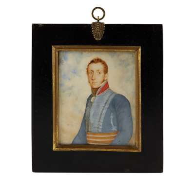 Note: Please note that although the handwritten labels verso state that the sitter of this portrait is John Byng, 1st Earl of Strafford, research has suggested that due to the uniform depicted, this is much more likely to be Lieutenant-Colonel John Byng (1803-1865), the nephew of Lord Torrington. He served in the 6th Madras Light Cavalry, and the uniform depicted appears to depict one of the East India Company's light cavalry regiments in the early 19th century.