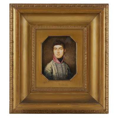 watercolour and bodycolour on ivory, in a glazed giltwood frame, with handwritten label to verso 'This picture of Henry Bellairs was painted A.D 1811, when he was a Lieutenant in the 15th Royal Hussars & when he was 21 years old'