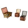 comprising a penwork example of sarcophagus form decorated with Classical scenes, opening to a twin-lidded interior, 24cm wide; and two single tea caddies of cubic form, one with a parquetry top and lidded interior; the other with a cavetto moulded lid; both 11.5cm wide (3)