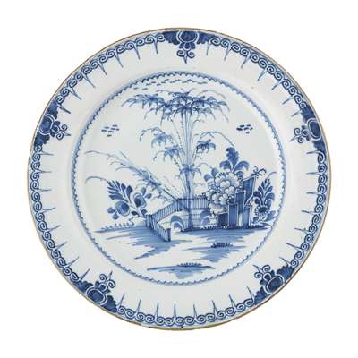 centrally decorated with flower vases within broad bands of stylised flowers, 35cm diam.; together with a further DUTCH DELFT BLUE AND WHITE CHARGER, depicting a fence and flowers, 34cm diam. (4)