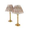 with urn-form nozzles above tapered columns and domed feet, decorated with engine-turned bands, with grey silk pleated shades; converted from candlesticks (2)