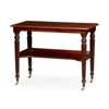 the rounded rectangular top with a moulded edge, raised on turned and tapered reeded legs ending on brass caps and castors and joined by a shaped undertier with a three quarter gallery