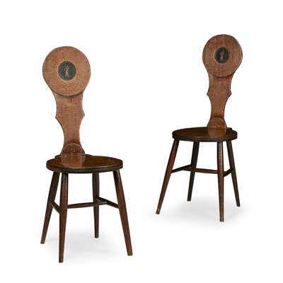 the shaped tapered splats surmounted by roundels painted with armorials, above circular seats, raised on tapered legs joined by H stretchers (2)