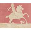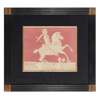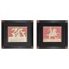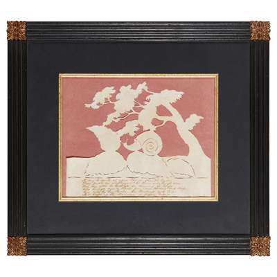 with handwritten verses, on pink paper grounds, in glazed ebonised frames; the first depicting a snail on leaves below a tree, 19cm x 24cm; the second a soldier in uniform on horseback, 19cm x 23.5cm (2)
