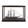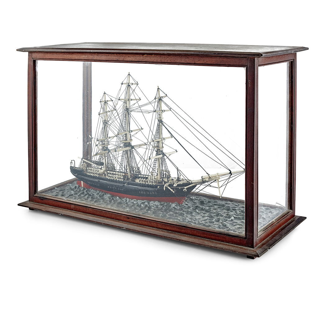 complete with three masts, rigging, life-boats, compass, and a painted wood hull, on a painted 'sea', in a four-glass case